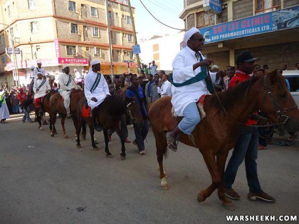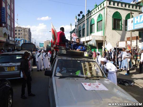 Gawaari ay kuxiran yihiin cod baahiyayaal ayaa laga sii deynayay salawaat iyo qudbado ay jeedinayeen culuma’udiin qeyb ka ahaa socodka dheer ay dadweynaha ku marayeen wadooyinka xaafada Eastleigh isla markaana ku labisan dares ka tarjumayo Dareeska Muslimiinta caanka kuyihiin.