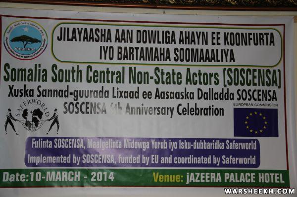 Muqdisho, March 10.2014-------Ra'iisul Wasaarhaa Xukuumada Federaalka Soomaaliya Mudane Cabdiweli Sheekh Axmed Maxamed ayaa galabta ka qeybgalay munaasabada sanad-guurada 6-aad ee Jilayaasha aan Dawliga aheyn ee Koofurta iyo Bartamaha Soomaaliya (SOSCENCA), wuxuuna ka codsaday hay'addaha aan dawliga aheyn iyo ururada bulshada rayidku inay dawladda kala shaqeeyaan isku soo dhoweynta bulshada iyo horumarinta nabadda.