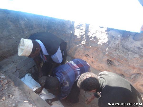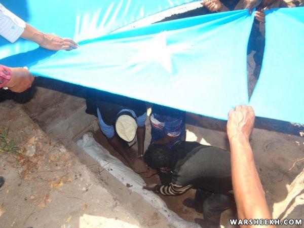 Allaha u naxariistee meydka marxuumka ayaa lagu aasay qubuuraha Iskuul Boliisiya, kadib markii laga soo gelbiyay garoonka diyaaradaha, iyadoo salaadda Janaasada lagula tukaday isla goobta lagu aasay.