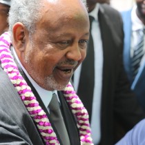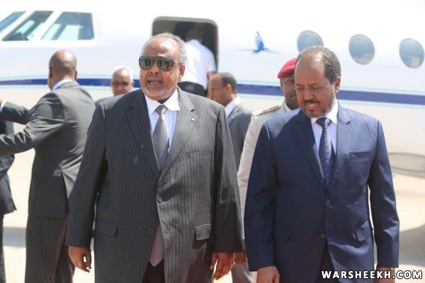 21 Febraayo 2015, Muqdisho: Madaxweynaha Jamhuuriyadda Djibouti Mudane Ismaaciil Cumar Geelle iyo wafdi uu horkacayo ayaa maanta ka soo degey garoonka diyaaradaha caalamiga ee Aadan Cadde ee magaalada Muqdisho, waxaana u bilowdey socdaal rasmi ah oo u dalka ku yimid.