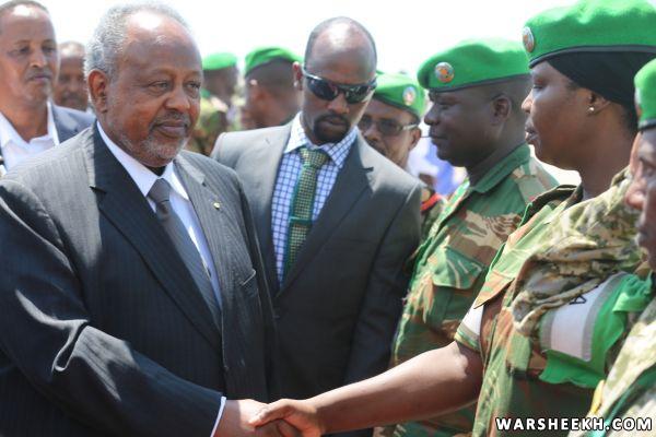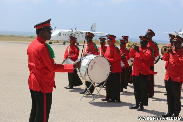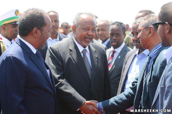 Wafdiga waxaa garoonka ku soo dhoweeyay Madaxweynaha Jamhuuriyadda Federaalka Soomaaliya, Mudane Xasan Sheekh Maxamuud, Raiisul Wasaaraha Dowladda Federaalka Mudane Cumar Cabdirashiid Sharma’arke, xubno ka tirsan Golaha Wasiirrada, Baarlamanka, Taliyeyaasha Ciidammada, Danjiraha Djibouti u fadhiya Soomaaliya Dayib Dubbad Rooble, Taliyeyaasha Ciidammada Midowga Afrika ee AMISOM, iyo mas’uuliyiin kale.