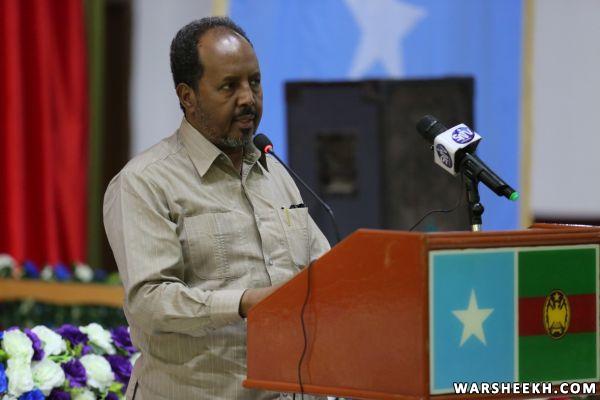 Madaxweynaha Jamhuuriyadda Federaalka Soomaaliya, ahna Taliyaha Guud ee Ciidammada Qalabka Sida, Mudane Xasan Sheekh Maxamuud, ayaa maanta ka qeybgaley aas qaran oo xarunta Wasaaradda Gaashaandhigga ee magaalada Muqdisho loogu sameeyay Allah ha u nax