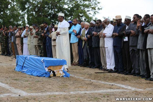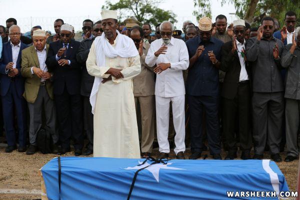 Waxaa uu Madaxweyne Xasan Sheekh Maxamuud uu munaasabadaasi mid mid ugu gacanqaadey xubnaha qoyska marxuumka, isagoo marxuumka Ilaahay uga baryey inuu naxariistii janno ka waraabiyo, iyagan uu samir iyo iimaan Ilaahay ka siiyo.