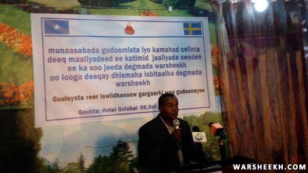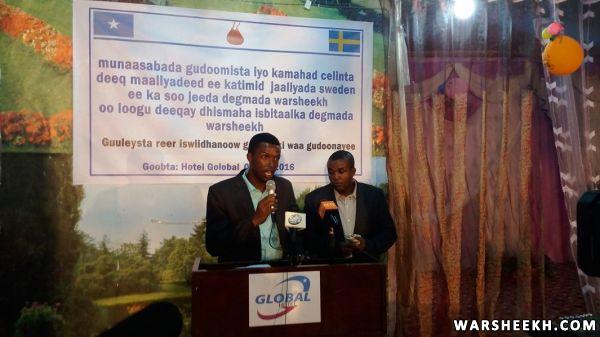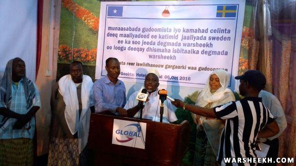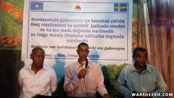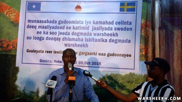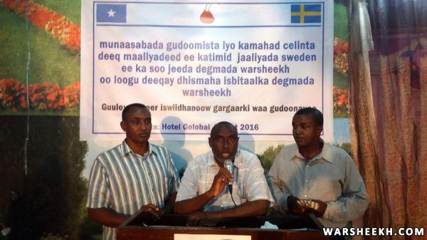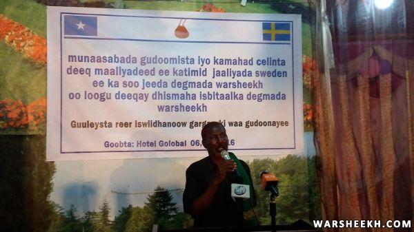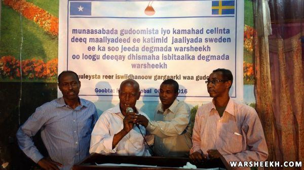 Nabadoon Cumar Ibraahim Cosobow oo ah hogaanka waxgaradka ee ka soo jeeda degmada Warsheekh ayaa ka mahad celiyay deeqada maaliyadeed ee ka timid jaaliyada Sweden isagoo tix Shirib ku cabiray dareenkiisaa ku aadan hab maamuuska xafladda iyo sida wanaagsan ee jaaliyadda Sweden oo lacagta ugu deeqday isbitalka uga soo jawaabeen baaqi ahaa dhismaha isbitaalka hooyada iyo dhallaanka degmada.