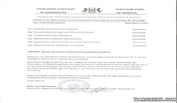 War qoraal ah oo kasoo baxay Wasaaradda Warfaafinta Isgaarsiinta Boostada iyo wacyi galinta Hidaha ee maamulka Puntland ayaa lagu sheegay in Shaqooyinkii uu Tv-ga Universal ka haayay Deegaanada uu ka Arrimiyo maamulka Puntland laga joojiyay.