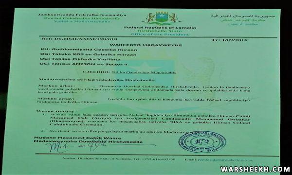 Dhinaca kale Wareegto kasoo baxday Xafiiska Madaxweynaha Hirshabeelle Maxamed Cabdi Waare 1-dii Bishii la soo dhaafay ee Setemper ayaa waxaa xilalkii looga qaaday Saraakiishan maanta lagu xiray Baladweyne,halka taliyaha Nabadsugida Gobolka Hiiraan loo Magacaabay Colaad cabdullaahi Cismaan.