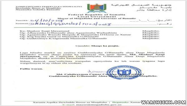 Sdioo kale Guddoomiyaha Gobolka Banaadir ahna Duqa Muqdisho Cabdiraxmaan Cumar Cusmaan (Eng. Yarisow) ayaa faray Mas’uuliyiintan in ay la socdaan in shaqadii laga joojiya Shadoor Xaaji Maxamuud.