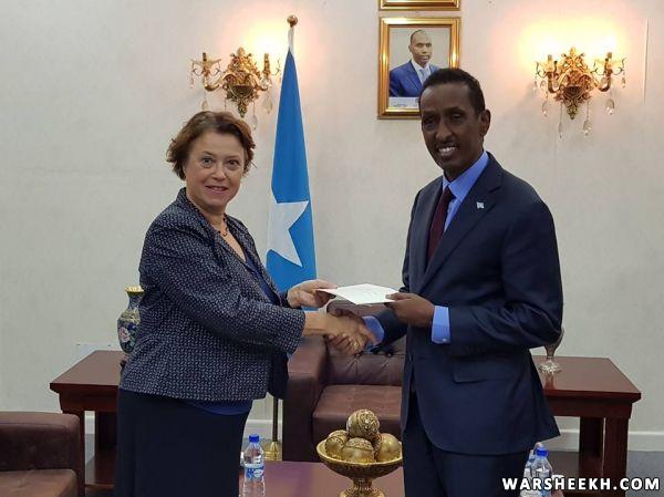 Wasiirka Arrimaha Dibadda iyo Iskaashiga Caalamiga ee Jamhuuriyadda Federaalka Soomaaliya, Mudane Danjire Axmed Ciise Cawad, ayaa ka guddoomay nuqul ka mid ah warqadaha aqoonsiga danjiranimo Safiirka cusub ee France ee Soomaaliya Marwo Aline Kuster-M