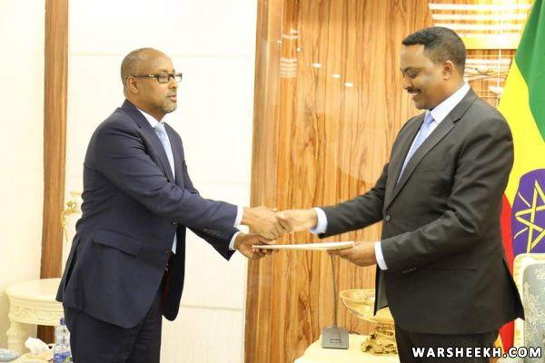 Safiirka Jamhuuriyadda Federaalka Soomaaliya ee Dalka Itoobiya, Mudane Cali Shariif Axmed, ayaa nuqul ka mid ah warqadaha aqoonsiga danjiranimo u gudbiyay Wasiirka Arrimaha Dibadda, Mudane Dr. Workneh Gebeyehu.